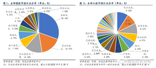 港股上市公司市值分布相对较集中,金融板块市值占比超过30%。截至2023年9月30日,市值排名前10%的公司总市值占全部港股近90%。从全部港股的行业分布来看,占市值权重排名前三的行业分别是金融(市值占比30.45%)、资讯科技(TMT为主,市值占比16.9%)以及非必须消费(市值占比14.35%),前三大行业合计市值占比达到61%以上。相比之下,A股上市公司市值分布相对分散且均匀,占市值权重排名前三的行业,电力设备、电子、医药生物合计市值占比仅26%。港股中金融板块加上地产建筑板块市值占比合计达到38%左右,而A股中金融地产类板块市值占比合计仅为15%。港股市场行业分布更偏向低估价值。