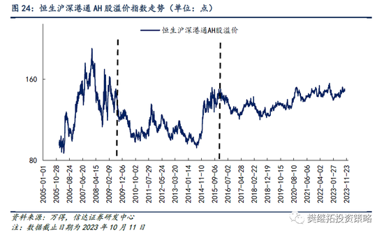 第四个阶段2016年至今,AH股溢价大部分时间在113-155的区间震荡。2014年底沪港通开通,2016年底深港通开通,南向资金的加持下,AH股溢价趋于震荡。2016-2018年AH股溢价有所下滑,但下滑幅度并不大。2019年至2023年8月,A股整体跑赢港股。AH股溢价水平缓慢回升到150%以上的历史高点,接近2016年初的水平。当前AH股溢价表明港股存在一定的“洼地”价值。