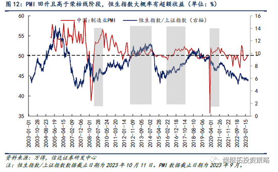 (3)历史上PMI回升且高于荣枯线阶段,恒生指数大概率有超额收益。包括2009年3月-12月,2012年8月-2014年7月,2016年2月-2017年9月,恒生指数通常能够产生20%左右的超额收益。