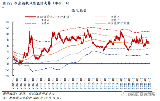 对港股的判断:我们认为,当前港股接近底部区域运行,当前处于左侧布局阶段,未来关注重点或在于国内经济复苏情况,其次关注美联储加息节奏。2022年10月至今,港股行情出现反复,主要与国内经济恢复波折较多有关。我们认为,虽然当前需求不足的情况仍然存在,当前存在的积极因素在于,第一是库存周期可能进入下行尾声。第二是乐观情况下房地产销售可能企稳。从7-8月的高频数据来看,PMI、PPI、工业企业利润等数据已经出现企稳的迹象。考虑到稳增长政策力度不断加强,港股对政策和经济修复或有更高的弹性。流动性方面,短期内由于美联储加息节奏存在不确定性、十年美债收益率仍在不断上升、人民币汇率贬值、美元指数持续走强,可能仍存在一定的负面因素,但中长期来看中美经济基本面的相对强弱可能仍将是影响海外资金面的主要因素。