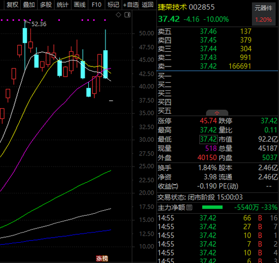 捷荣技术是华为概念龙头股之一,在短短一个多月里,股价从9.02元飙升至52.36元,涨幅接近5倍。昨日,该股一度走出“天地板”行情,换手率高达25.82%,成交额超过30亿元。今天则惊现一字跌停“闷杀”,换手率仅为1.84%。