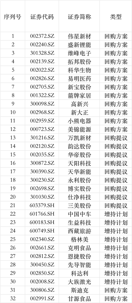 A股市场回购增持热潮持续上演。截至记者发稿,今日已有32家公司公布回购方案、回购提议或增持计划。