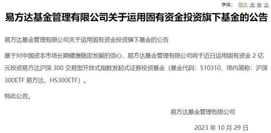 近日,多家头部公募出手自购。10月29日,易方达基金公告称,基于对中国资本市场长期健康稳定发展的信心,将于近日运用固有资金2亿元投资易方达沪深300ETF。