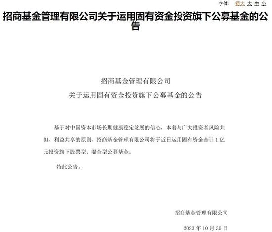 10月30日,招商基金也公告称,基于对中国资本市场长期健康稳定发展的信心,本着与广大投资者风险共担、利益共享的原则,招商基金将于近日运用固有资金合计1亿元投资旗下股票型、混合型公募基金。
