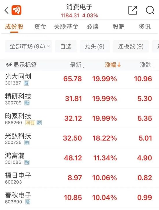 今日,消费电子板块震荡走高,板块内个股掀起涨停潮。截至收盘,光大同创、精研科技、春秋电子等多股涨停。