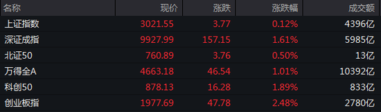 今日,A股三大指数集体收涨,创业板指涨幅居前,沪指更是五连涨。截至收盘,沪指涨0.12%,深证成指涨1.61%,创业板指涨2.48%,两市超3600只个股上涨。沪深两市成交额在时隔两个月后再次突破万亿元,全天成交合计10381亿元,较上一日放量737亿元。