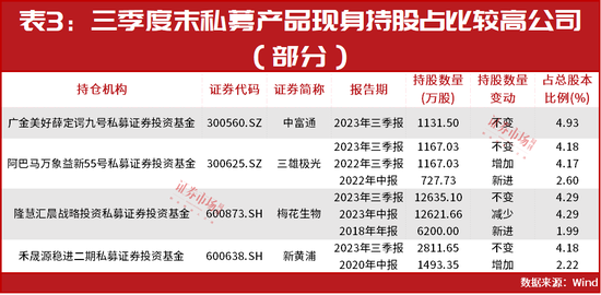 另据统计发现,中富通、三雄极光、梅花生物(维权)、新黄浦等公司也被部分私募旗下相关产品持有超4%的股份(见表3)。