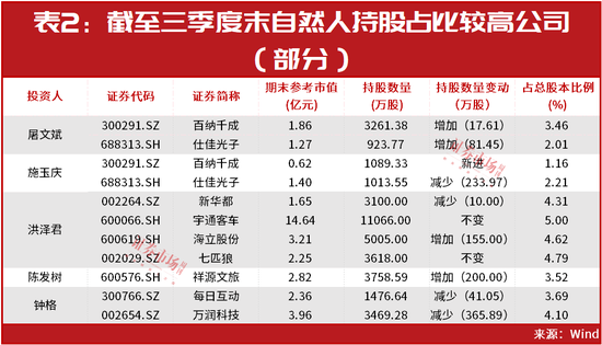 除了屠文斌、施玉庆“夫妻档”以及洪泽君等,还有多位自然人牛散对所布局公司进行了加码,且持股占比进一步提升。如陈发树,其三季度加仓祥源文旅200万股至3758.59万股,持股占比增至3.52%;截至三季度末,钟格持仓每日互动(维权)、万润科技等公司占比也均超过3%(见表2)。