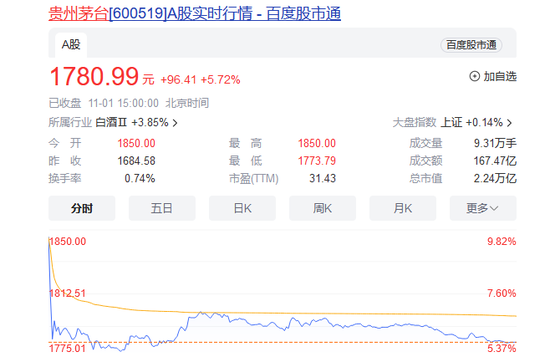 受提价利好提振,贵州茅台今日开盘即逼近涨停,但随后涨幅有所回落,收盘上涨5.72%报1780.99元,全日成交167.5亿元,最新市值约2.24万亿元。