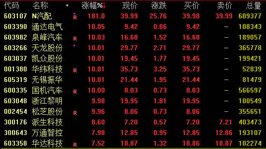 汽车产业股今日走势活跃,截至收盘,通达电气、泉峰汽车、天龙股份、凯众股份、华纬科技、无锡振华等涨停。