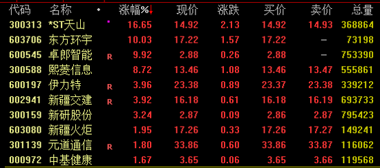 新疆本地股集体走高,截至收盘,*ST天山涨近17%,东方环宇、卓郎智能涨停,熙菱信息(维权)涨近9%。