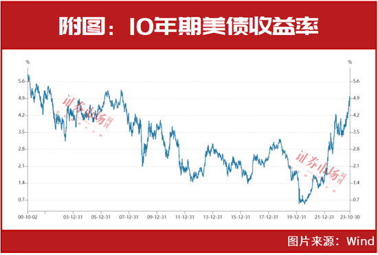 近阶段以来,做多A股的力量仍在持续加码。如“国家队”中央汇金持续大笔买入、增发1万亿元国债等。另外,经济数据显示,前三季度我国GDP同比增长5.2%,其中三季度GDP同比增长4.9%,这显示出我国经济整体呈现稳步向好。当然,外围市场也存在一些不确定性因素的扰动。如作为无风险利率重要参考指标的美债收益率持续上升(见附图),这在一定程度上可能会对资金的态度构成扰动。