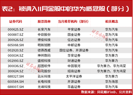 据不完全统计显示,目前已有210只个股被券商调入11月金股池,其中,不少个股均为华为概念股,主要涉及汽车、计算机等相关领域公司,如长安汽车、明新旭腾、盛视科技、超图软件等(见表2)。