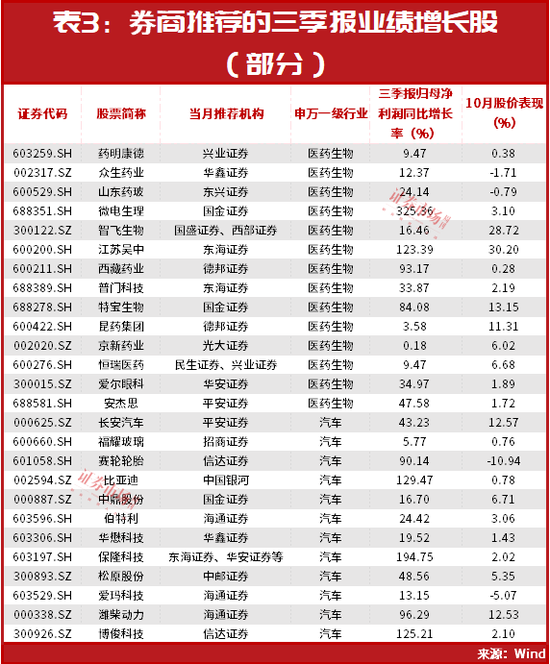 统计券商推荐的11月金股发现,不少个股即为三季报业绩迎来显著增长的公司。统计数据显示,在券商目前推荐的210只个股中,140家公司三季报业绩实现增长,占比近7成。进一步来看,在业绩实现增长的公司中,其中医药生物、汽车等是分布最为聚焦的行业,相关公司数量均超过10家,具体公司包括微电生理、西藏药业、特宝生物;保隆科技、博俊科技、赛轮轮胎等。