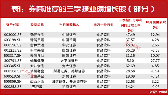 从券商推荐的11月金股来看,众多券商对以“股王”贵州茅台为代表的白酒股及其所属的食品饮料板块给予了较大关注。据不完全统计,在券商推荐的11月金股中,贵州茅台、迎驾贡酒、古井贡酒、泸州老窖、山西汾酒、五粮液等白酒龙头股均位列其中。整体来看,这些公司三季报普遍实现了业绩显著增长,其中贵州茅台实现业绩增速为19.09%,迎驾贡酒、古井贡酒、山西汾酒等增速均超过30%(见表1)。