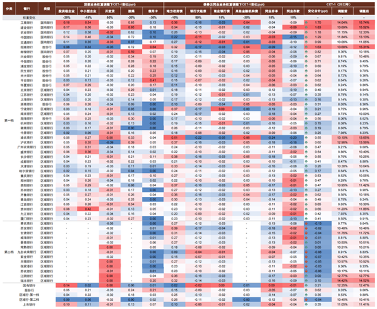 预计资本新规落地有望形成一定资本节约。我们对资本新规的资本节约效应进行了测算,其中:1)对于使用权重法的大部分上市银行(第一档银行),我们估算本次新规能够提高核心一级资本充足率35bp,其中国有大行/股份行/第一档区域行核心一级资本充足率正向贡献21bp/62bp/35bp,对按揭、信用卡、优质企业客户贷款比重更高,资本节约效应越大;2)对于使用内评法的五大行及招行,如果资本底线下调(80%下调至72.5%)全部转为资本节约,我们估算能够额外提高核心一级资本充足率约1ppt。
