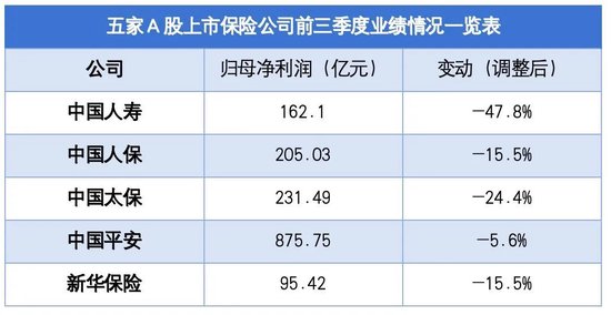具体来看,今年前三季度,中国人民保险集团股份有限公司(下称“中国人保”,601319.SH,1339.HK)、中国人寿保险股份有限公司(下称“中国人寿”,601628.SH,2628.HK)、中国平安保险(集团)股份有限公司(下称“中国平安”,601318.SH,2318.HK)、中国太平洋保险(集团)股份有限公司(下称“中国太保”,601601.SH,2601.HK)、新华人寿保险股份有限公司(下称“新华保险”,601336.SH,1336.HK)的归母净利润表现如下表所示: