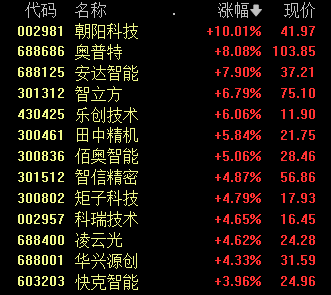 11月3日,苹果概念股早盘走强。截至发稿,朝阳科技五连板,奥普特涨超8%,安达智能、凌云光、田中精机等多股跟涨。