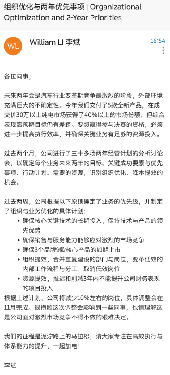 然而,就在下午五点,蔚来汽车董事长、CEO李斌发布针对蔚来员工的全员信,信中确认了蔚来将减少10%左右的岗位,具体调整会在11月完成。