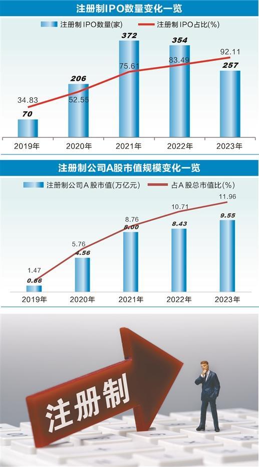 从数量上看,通过注册制上市的公司数量不断扩大。证券时报·数据宝统计,2019年注册制IPO公司有70家,占当年IPO公司总数的比例为34.83%。从2020年开始,注册制IPO公司数量大幅上升,占A股IPO公司总数比例也明显提升。2021年、2022年注册制IPO公司均超300家。截至11月3日,2023年注册制IPO的公司有257家,占全年IPO总数的92.11%。