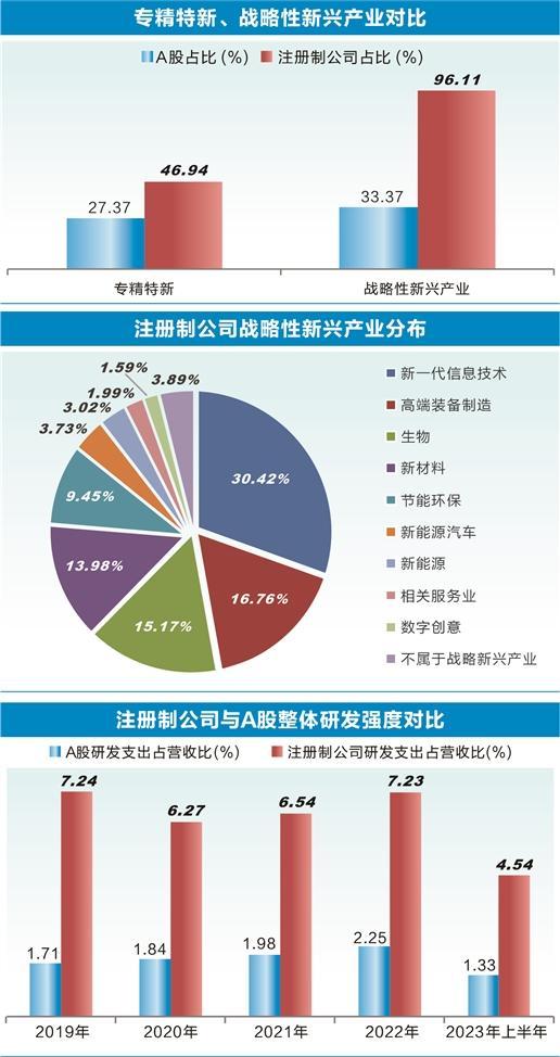 高强度的研发投入,是上市公司保持创新活力、科技创新能力的有力保障。数据宝统计,2019年至2022年,注册制公司研发支出占营收比例均超过6%,是同期A股整体水平的3倍以上。今年上半年,注册制公司研发支出占营收比为4.54%,是同期A股整体水平的3.42倍。