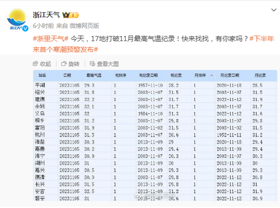 以浙江为例,气温仿佛坐上了火箭,17个县市今日最高气温打破11月最高纪录。杭州则以31.5℃的“热度”,超越1952年,成为1951年有连续观测纪录以来,11月的历史第一热。