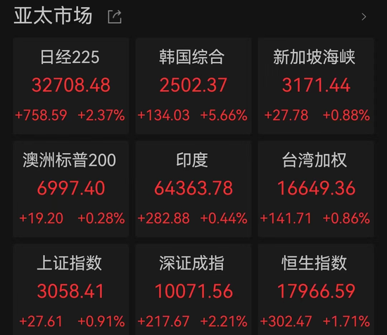 港股方面,两大股指盘中强势拉升,恒指一度涨超2%收复18000点,恒生科技指数涨超4%重返4000点上方。截至收盘,恒生指数涨1.71%报17966.59点,恒生科技指数涨4.09%报4098.59点。个股方面,理想汽车、阅文集团涨超11%,金蝶国际涨近10%,蔚来、小鹏汽车涨超7%,美团涨超5%。