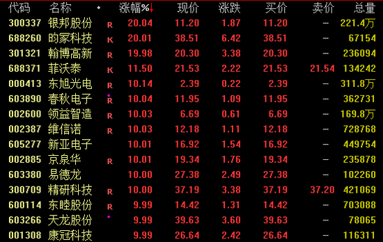 消费电子概念再度走强,截至收盘,昀冢科技涨停创历史新高,银邦股份、翰博高新、春秋电子、领益智造、维信诺、易德龙、精研科技、天龙股份等均涨停。