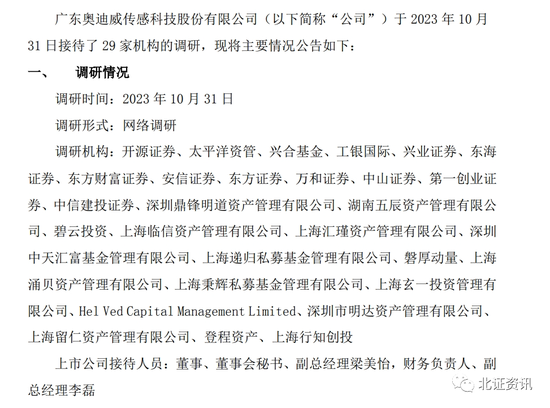 奥迪威也于近日迎来一个由29家机构组成的调研团队,包括开源证券、太平洋资管、兴合基金、工银国际、上海秉辉私募基金管理有限公司、上海玄一投资管理有限公司、Hel Ved Capital Management Limited、深圳市明达资产管理有限公司等。