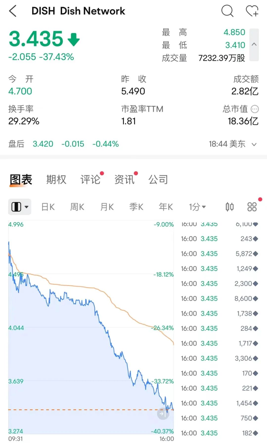 财报暴雷,美国第四大在线直播电视节目提供商Dish Network暴跌37.43%,创近25年来股价新低。