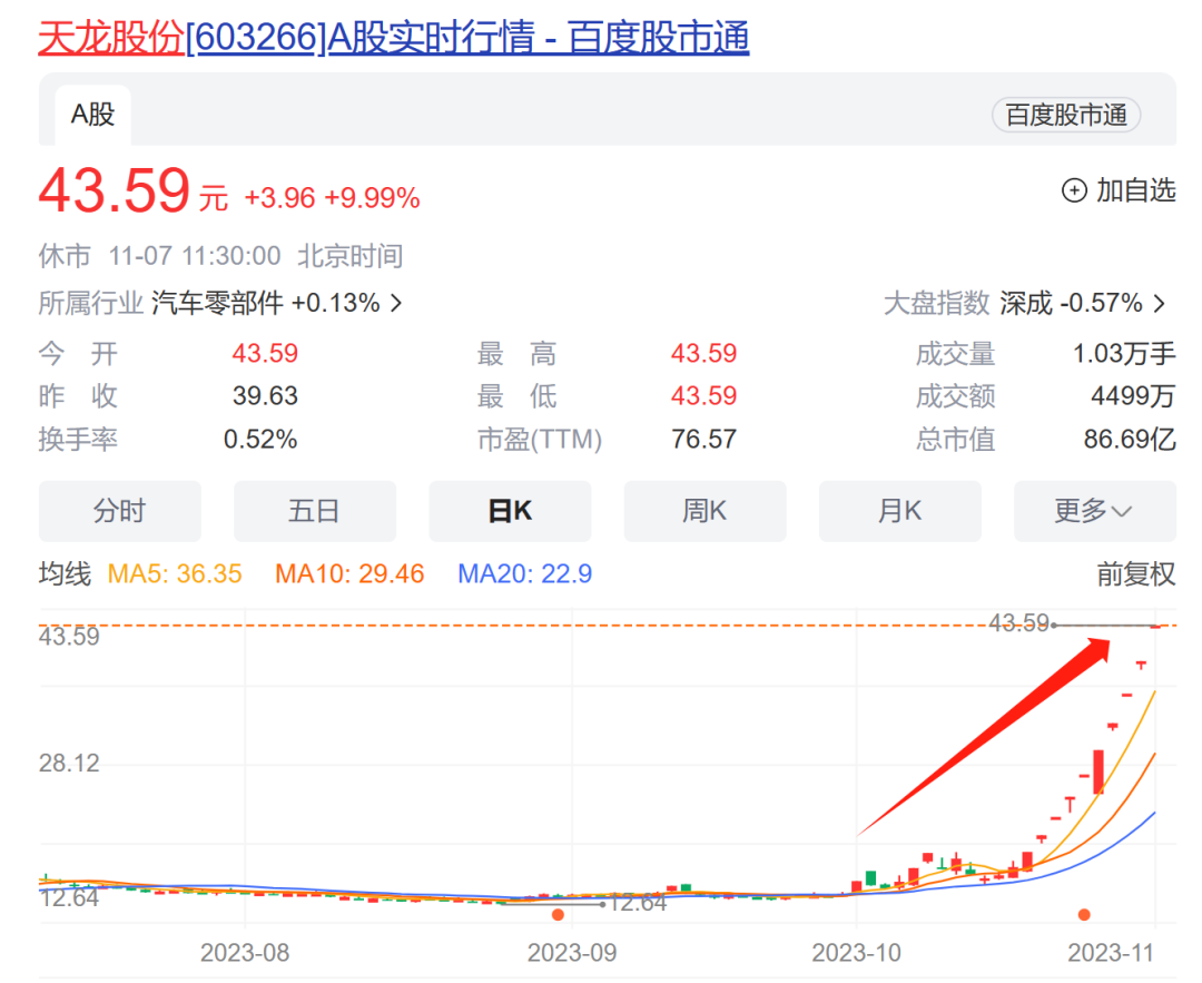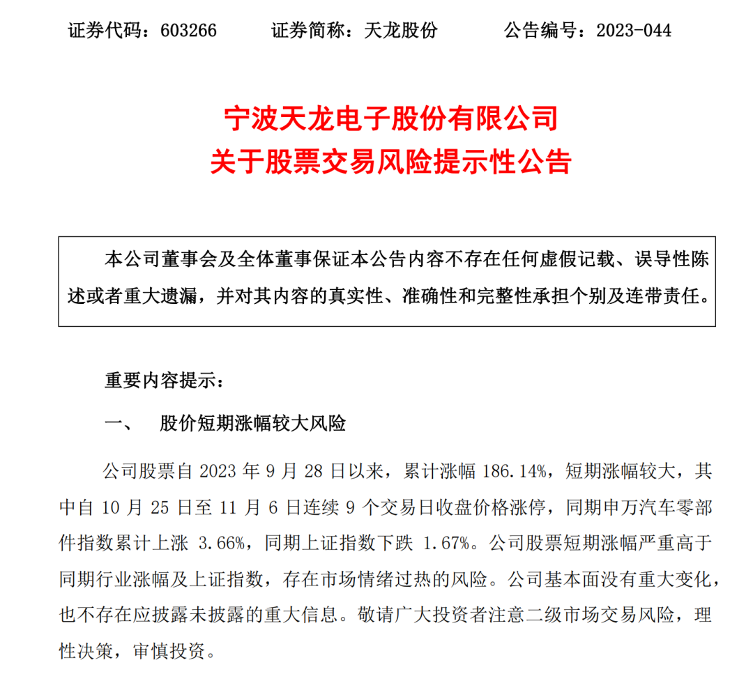 实际上,天龙股份近日曾多次发布异动公告提示风险。昨日晚间,天龙股份公告,其股票自2023年9月28日以来累计涨幅186.14%,其中自10月25日至11月6日连续9个交易日收盘价格涨停,股票短期涨幅严重高于同期行业涨幅及上证指数,存在市场情绪过热的风险。
