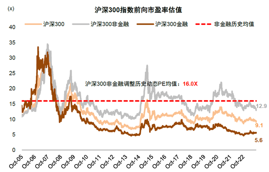 当前A股市场整体估值处于历史低位。截至10月20日,沪深300指数前向市盈率9.1倍,前向市净率1.0倍,明显低于2005年以来的历史均值12.4倍和1.7倍。其中,非金融部分前向市盈率12.9倍,位于历史均值16.0倍向下0.7倍标准差附近;前向市净率1.6x,也位于历史均值2.1倍向下0.6倍标准差。A股市场当前整体估值水平与2019年初、2020年3月以及10月底时期相近,处于历史低位。