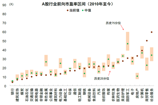 行业分化延续,部分新能源、先进制造、周期板块估值位于历史偏低位。经历调整后,电力设备板块估值基本回到历史区间下限;交通运输、有色金属、石油石化、煤炭等周期行业的估值也较低,低于历史15%分位数;食品饮料、医药生物等外资持仓占比较高的行业估值接近历史中值附近。