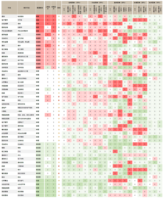 综合对增长及政策的预期、自下而上中金行业分析员的观点,并考虑行业的景气程度及估值等因素,我们更新了行业配置表格。后续仍将根据增长、政策及估值等因素来综合评估及调整配置建议。