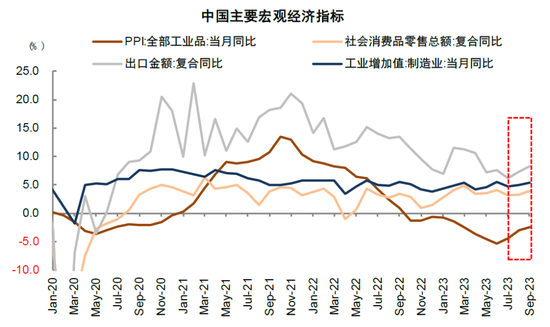 2)物价修复程度:2023年在总需求恢复相对缓慢,而制造业投资为代表的供给侧连续高增长之后,供需不平衡叠加工业企业加速去库存影响下,CPI和PPI均相对偏弱,前三季度GDP平减指数同比下滑0.78%,也是企业盈利与经济景气背离的主因;2024年伴随供需矛盾缓解,以及工业库存降至低位,物价下行压力或得到改善,修复幅度取决于内外需的恢复情况。