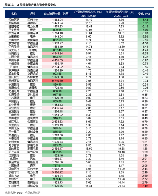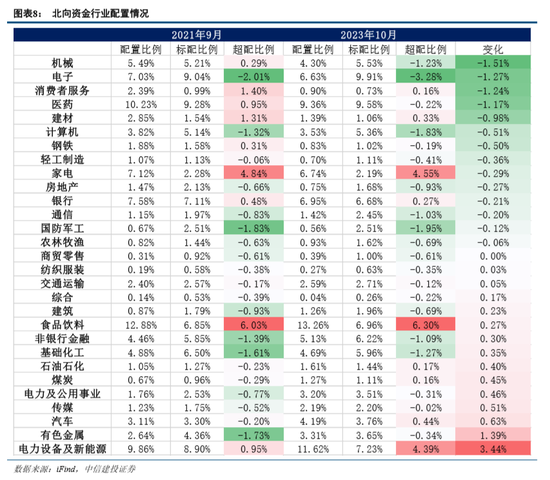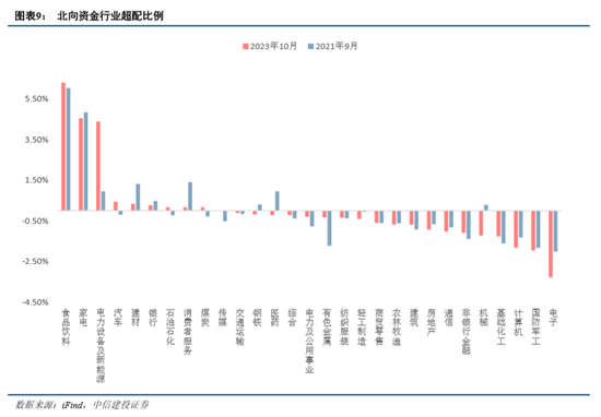 从北向资金来看,通过计算2021年9月和2023年10月陆股通市值以及整个市场在不同行业的配置比例和变化来分析外资对A股板块的偏好,数据显示北向资金对食品饮料、家电、电力设备以及新能源板块相较于整个市场配置比例较高。而自2021年9月海外流动性趋紧开始,外资在机械、消费者服务、电子、医药和建材等板块减持较多,即超配比例减少最多。