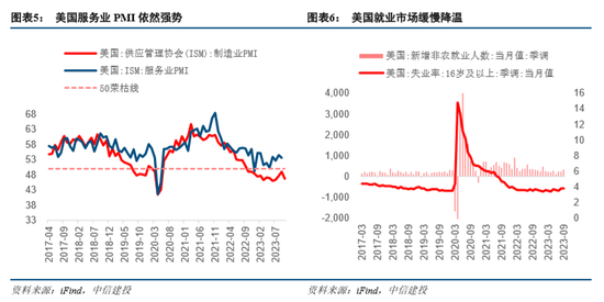 劳动力市场方面,疫情结束后美国就业市场供不应求,持续火热。美联储自今年六月以来的statements对job gains给出的评价分别为robust、robust、slowed but remain strong、moderate but remain strong,也表明就业市场正在缓慢降温。从就业数据来看,美国8月和9月新增非农大超预期,失业率在低位徘徊,直到10月才看到了新增非农和失业率放缓的状况。强势的就业数据体现了美国经济的韧性,但就业市场缓慢降温、供需趋于平衡的态势没有改变。