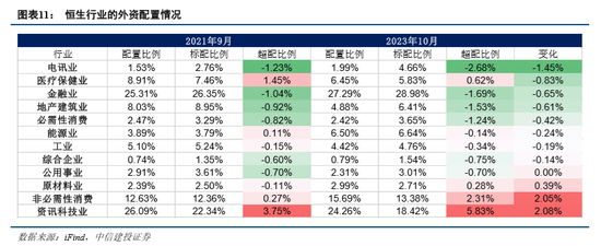 再看港股,通过计算不同恒生行业中国际机构中介持股市值占比,我们发现资讯科技业、医疗保健业以及非必需性消费行业的国际机构中介持股市值的比例较高。而自海外流动性趋紧开始,外资对电讯业、医疗保健业、金融业以及地产建筑业的减持较多,即相较于21年9月的超配比例,23年10月的超配比例下降最多。