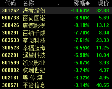 截至发稿,海看股份跌超10%,丽尚国潮、唐德影视跌超8%,掌阅科技、百纳千成、幸福蓝海等跌幅居前。