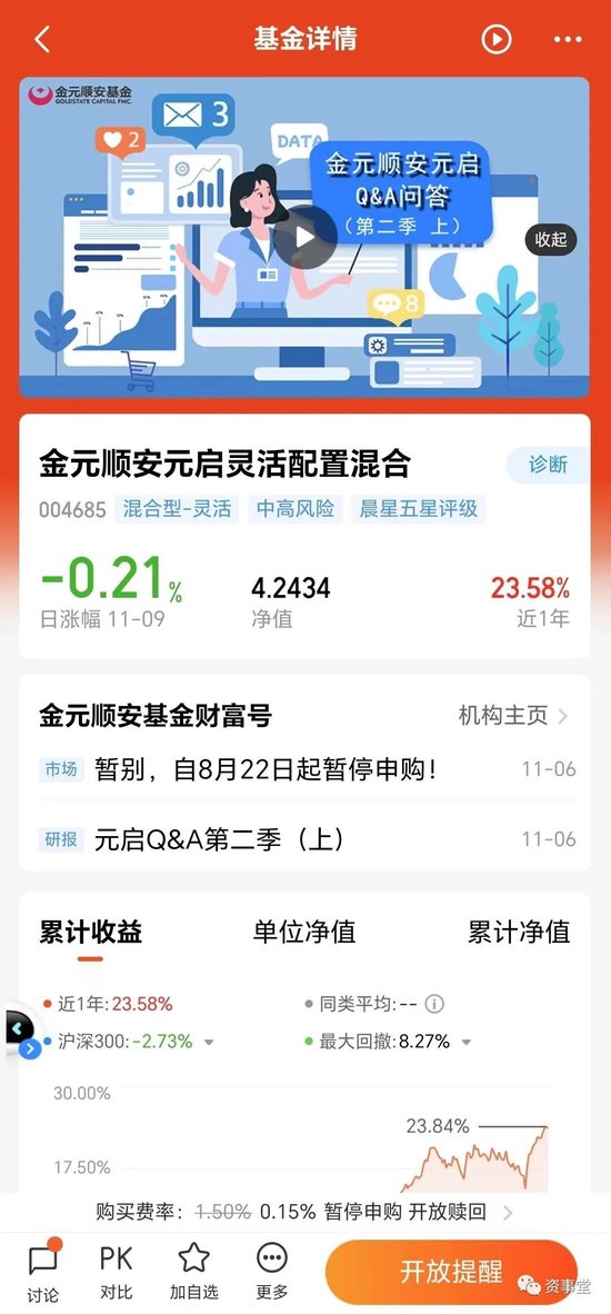 11月6日,金元顺安基金官方账号回应称,元启不是量化基金。