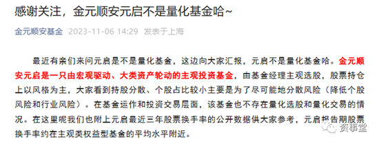 但11月6日,他所在金元顺安基金公号罕见的发了一篇“澄清文字”,题目是《感谢关注,金元顺安元启不是量化基金哈》。