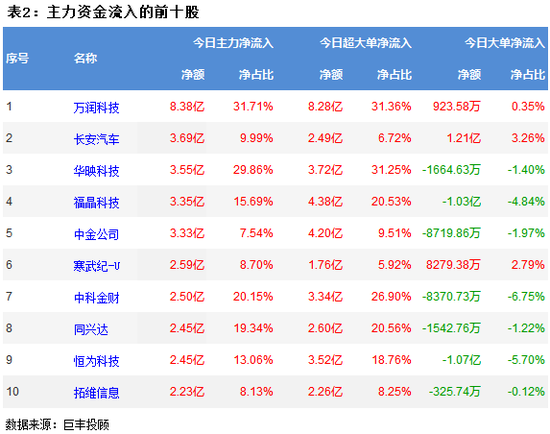 从两市个股主力资金流向来看,万润科技获主力资金净流入8.38亿,长安汽车获主力资金净流入3.69亿,华映科技获主力资金净流入3.55亿,福晶科技获主力资金净流入3.35亿,中金公司获主力净流入3.33亿。