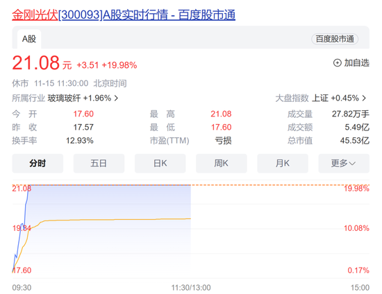 光伏板块早盘也放量高开高走,板块指数创近2个月来新高。金刚光伏开盘不到10分钟就直线20%涨停,中国长城、皇氏集团、通润装备、拓日新能等多股盘中均异动直线拉升至涨停。