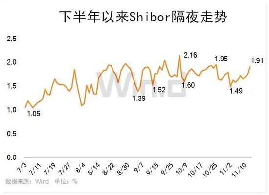 Wind数据显示,11月以来,隔夜Shibor逐步走高。其中11月2日一度下探到1.5%以下报1.494%,随后开启反弹,突破1.6%、1.7%,并于11月14日突破1.9%,创月内高点,同样也处于年内中高位。随着央行公开市场加大资金净投放,银行间市场利率是否会再度快速回落,呈现下行趋势值得关注。