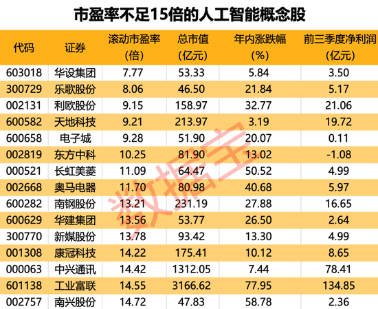 从估值指标来看,截至16日收盘,滚动市盈率不足15倍的有15只,华设集团以7.77倍位于前列,其次是乐歌股份、利欧股份、天地科技、电子城。