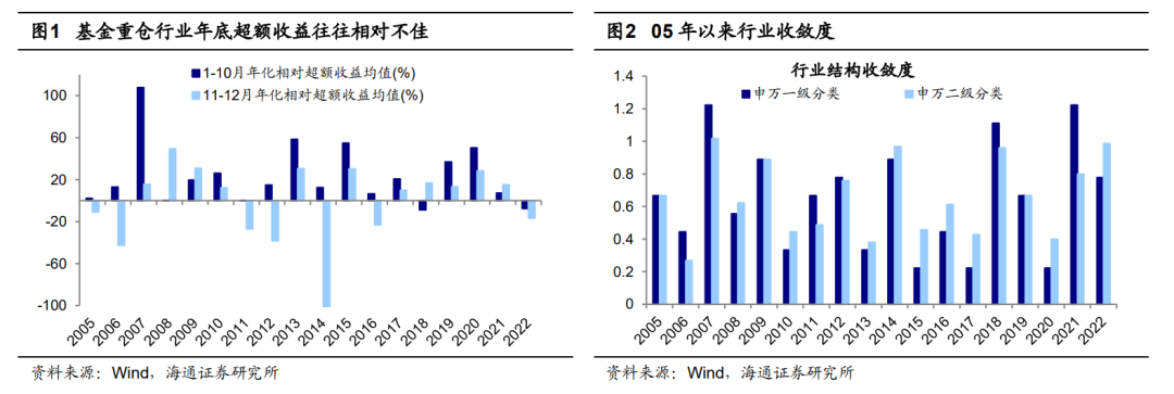 历史规律显示年底行业再平衡和基金重仓行业超额收益收敛概率较大。我们分别从基金重仓和全部行业层面出发,考察了05年以来年底行情结构的走向规律。从基金重仓行业角度看,年底基金重仓超额收益往往出现收敛。基金重仓行业一般指公募基金绝对持仓占比较大且大幅超配的行业,我们选取了满足以下标准的行业:①三季度基金持仓市值占比在前30%的行业;②基金持仓相对于自由流通市值的超配比例在前五的行业。我们发现历史上尽管多数年份前期公募基金能跑赢大盘,但年底公募基金重仓行业超额收益往往相对不佳,轻仓的行业表现反而相对较好,历年1-10月基金重仓行业年化超额收益均值为23.1个百分点,而11-12月仅为-5.0个百分点。