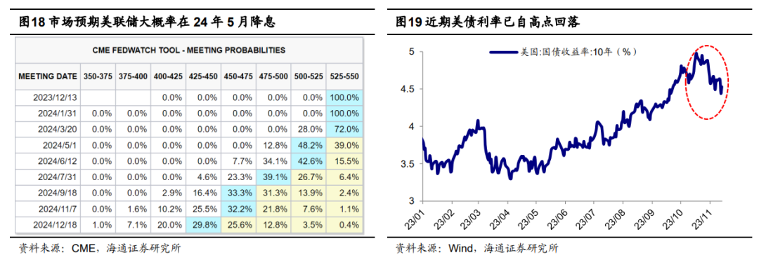 与此同时,当前海内外积极因素也正在显现,有望进一步催化行情展开。国内方面,10月30日-31日中央金融工作会议在北京召开,会议要求“建立防范化解地方债务风险长效机制,建立同高质量发展相适应的政府债务管理机制,优化中央和地方政府债务结构”,同时再次强调“活跃资本市场”,我们预计活跃资本市场相关政策或将加速落地。11月8日2023金融街论坛年会上央行行长潘功胜表示下一阶段货币政策将更加注重跨周期和逆周期调节,必要时还将对债务负担相对较重地区提供应急流动性支持。11月16日国家发改委召开新闻发布会,会上表示将做好明年政策靠前发力的各项准备工作。海外方面,外部环境正迎来多重利好:一是近期中美关系已出现积极变化,当地时间11月15日中美双方高层举行会晤,两国元首同意推动和加强中美各领域对话合作,包括建立人工智能政府间对话、明年早些时候大幅增加航班等,未来中美关系有望步入新阶段;二是美联储加息周期或已近尾声,10月美国CPI超预期降温,市场预期美联储大概率在明年5月降息,近期长短端美债利率已从高位回落。综合来看,海内外多重利好下,A股市场情绪和风险偏好有望得到提振,或催化行情继续展开。