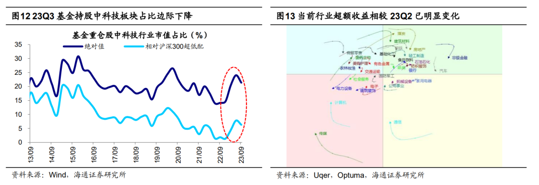 政策和技术驱动有望推动科技行情展开,滞涨的电子或更优。虽然今年前十个月科技板块在大类行业中领涨,申万大类行业分类下TMT今年前10个月涨幅为11%,但经济转型大背景下科技产业已成为新质生产力的重要支撑,叠加自身产业周期正迎来向上,在此背景下我们认为科技板块也有望成为主线。当前科技创新已成为经济转型的重要驱动,近期习近平总书记指出要“积极培育新能源、新材料、先进制造、电子信息等战略性新兴产业,积极培育未来产业,加快形成新质生产力,增强发展新动能”。新质生产力正是指以科技创新为主的生产力,往后看我们认为科技产业政策或将持续出台落地,加速形成新质生产力。此外,今年三季度以来科技板块超额收益和基金超配力度已明显收敛:从超额收益看,截至目前,跌幅最大时计算机行业已回吐此前涨幅的88%、通信为62%、传媒为72%;从基金持仓力度看,基金重仓股中科技板块市值占比已由23Q2的24%下降至23Q3的21%,相对沪深300超配比例同期由7.8个百分点下降至6.3个百分点。综合来看,当前科技板块超额收益趋势和基金超配力度已有所再平衡,政策催化和产业周期向上有望驱动科技行情展开。