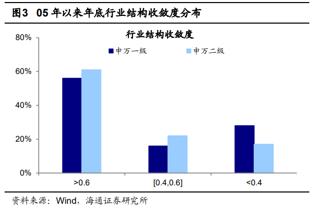 为了更为全面的研究,我们再从全部行业的角度来看,历史上约6成年份年底行业结构出现再平衡,仅2成左右延续分化。由于行业的情况更为复杂,我们构建了更为精细的行业收敛度指标,用“年底2个月表现前30%的行业中前10个月表现在后30%的占比+年底2个月表现在后30%的行业中前10个月表现在前30%的占比”来衡量行业结构的变化情况,申万一级行业分类下05年以来年底行业结构收敛度大于0.6的年份占比为56%(二级行业分类下为61%,下同),收敛度小于0.4的年份占比为28%(17%),收敛度在0.4~0.6之间的年份占比为16%(22%)。我们发现05年以来年底行业结构再平衡的现象在六成年份中存在,较为典型的如07、09、12、14、18、21、22年等,年底行业结构收敛度均较大;而行业结构延续仅发生在少数年份,包括10、13、15、17、20年;此外还有部分年份年底行业结构变化特征并不明显。