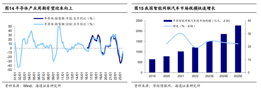 在科技的细分方向上,结合政策导向和技术进展,我们认为可重视以下三个方向:一是前期滞涨的电子等硬科技制造,今年以来电子在TMT板块中相对滞涨,今年前10个月电子中半导体涨跌幅仅为-2.3%,往后看,随着全球半导体周期回升叠加华为产业链向上突破,我国以半导体为代表的电子制造有望受益;二是财政政策发力下的数字基建,中央财政将在今年四季度增发2023年国债1万亿元,未来财政政策或更加积极,而数字基建作为稳增长和调结构的重要抓手,有望成为政府支出的重点。根据中国通服基建产业研究院的《中国数据中心产业发展白皮书(2023年)》,预计“十四五”期间我国数据中心产业规模复合增速将达到25%。三是技术变革的AI应用,例如在智能化技术进步的推动下,国产新能源车加速渗透,23年9月小鹏汽车共交付新车15310台,环比增长12%,同比增长81%,连续8个月保持强劲增长。根据华经情报网的数据,预计2025年我国智能网联汽车市场规模将达2262亿元,22-25年间CAGR为23.2%。